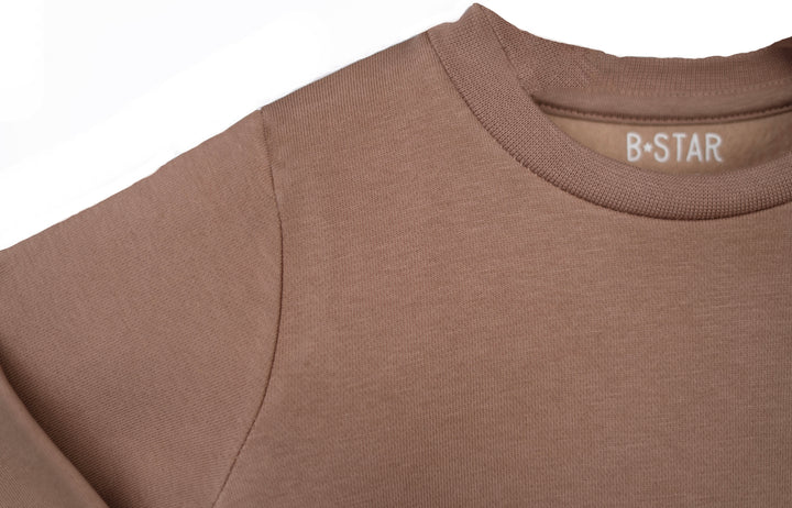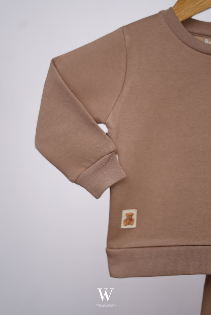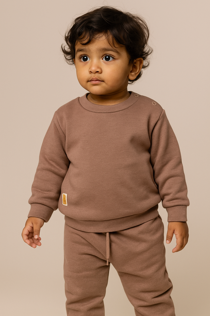 This cozy and stylish two-piece baby outfit features a soft, long-sleeve sweatshirt paired with matching jogger pants. Made from a breathable cotton-blend fleece, it provides warmth and comfort for active little ones while ensuring ease of movement. The sweatshirt includes shoulder snap buttons for easy dressing, and both pieces have ribbed cuffs for a snug fit. The jogger pants come with an elastic waistband and a drawstring for adjustable fitting. The set is perfect for casual outings, playtime, or relaxing at home, offering a minimalist, earthy tone suitable for both boys and girls